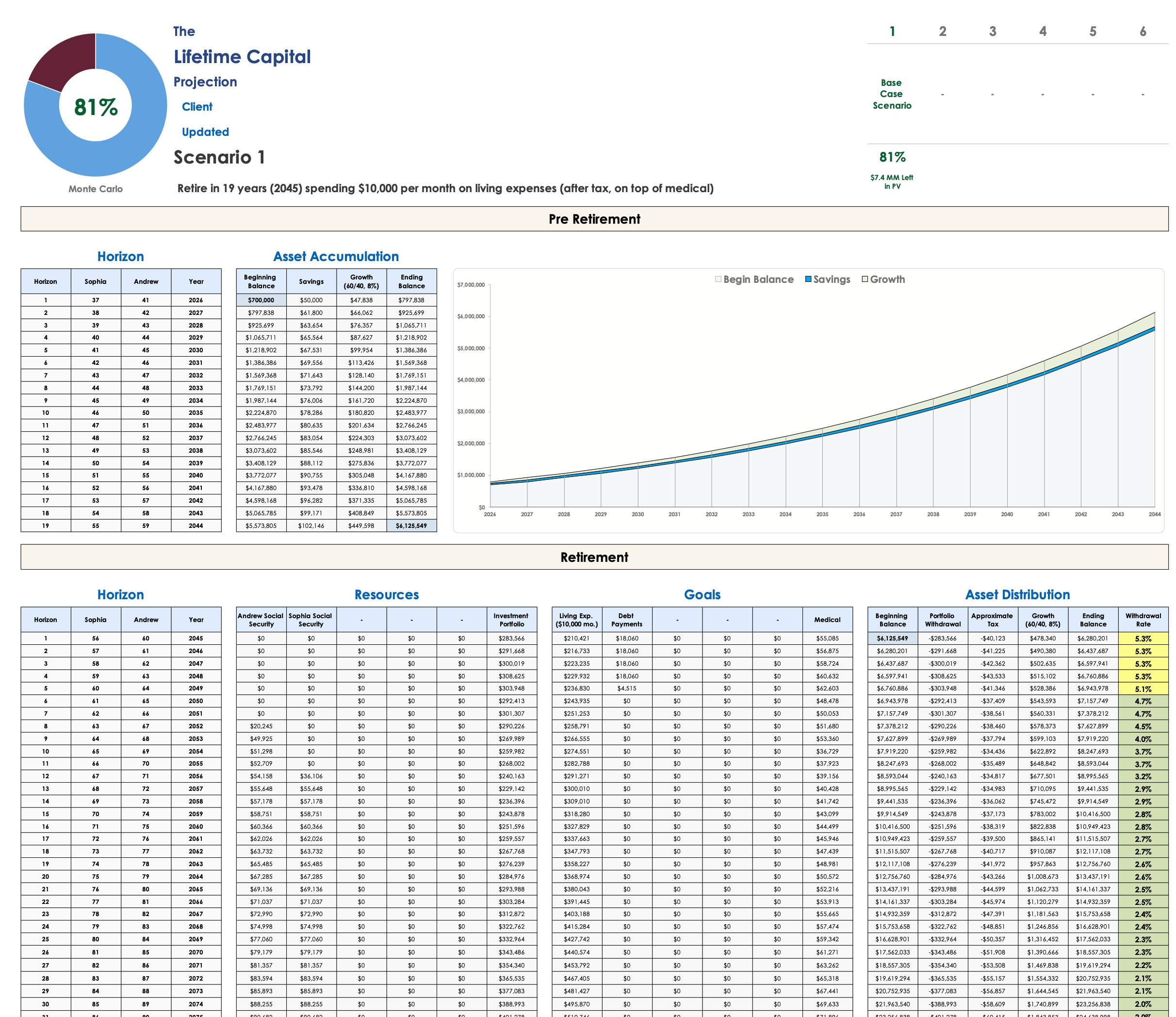 Plans are run through our proprietary Excel-based “Leviathan Model” which massively reduces data entry time. This is a robust model that relies on market data going back to 1928 (and the information you provide on the fact finder) to concisely illustrate the lifetime portfolio trajectory, retirement cash flow, 1,000 Monte Carlo simulations, real-world historical return sequences, and withdrawal rate analysis. lt uses a conservative ordinary income tax assumption across all retirement income sources and is not designed for detailed Roth conversion or drawdown sequencing analysis.